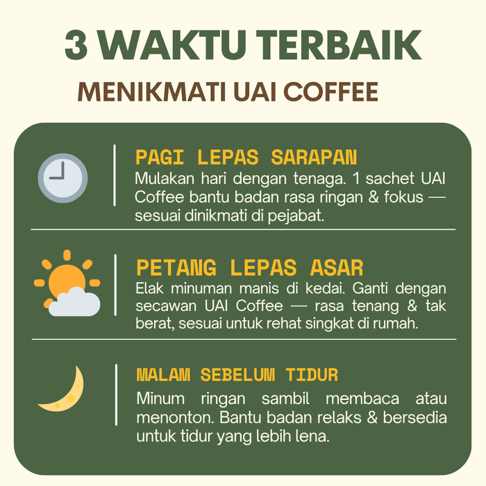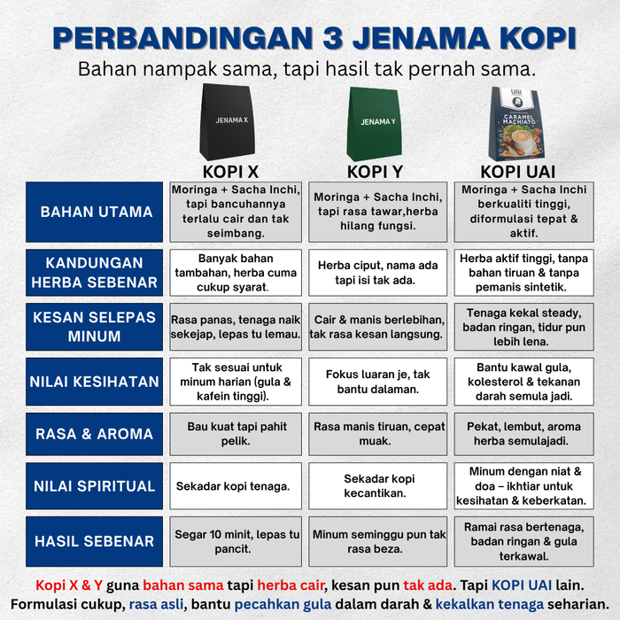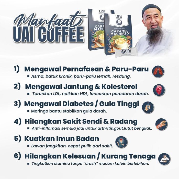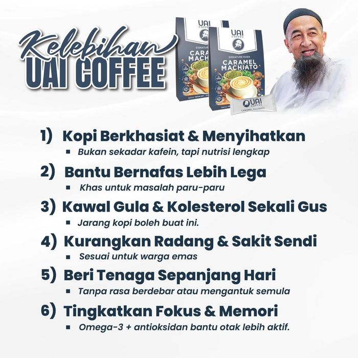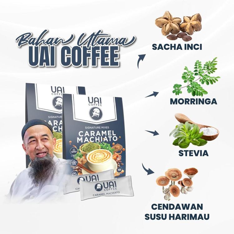 UAI Coffee dibuat daripada bahan aktif seperti Moringa, Sacha Inchi, dan White Tiger Mushroom, yang bantu kawal tenaga, gula, dan saraf secara semula jadi.